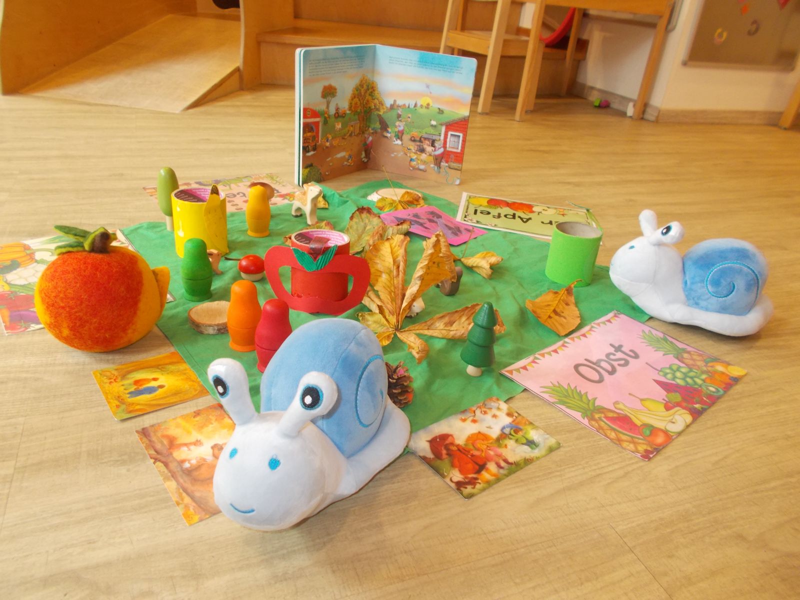 Heute wurde im Morgenkreis der schöne, farbenfrohe Herbst und die Schnecke Max mit dem Lied „Der Herbst ist da“ begrüßt. Wir haben gemeinsam aus verschiedenen Obst- und Gemüsesorten, bunten Blättern sowie mit (Holz-)Tieren des Waldes ein großes Herbstmandala gelegt. Anschließend wurden Drachen gebastelt – im Herbstwind sollen diese nun hochfliegen!