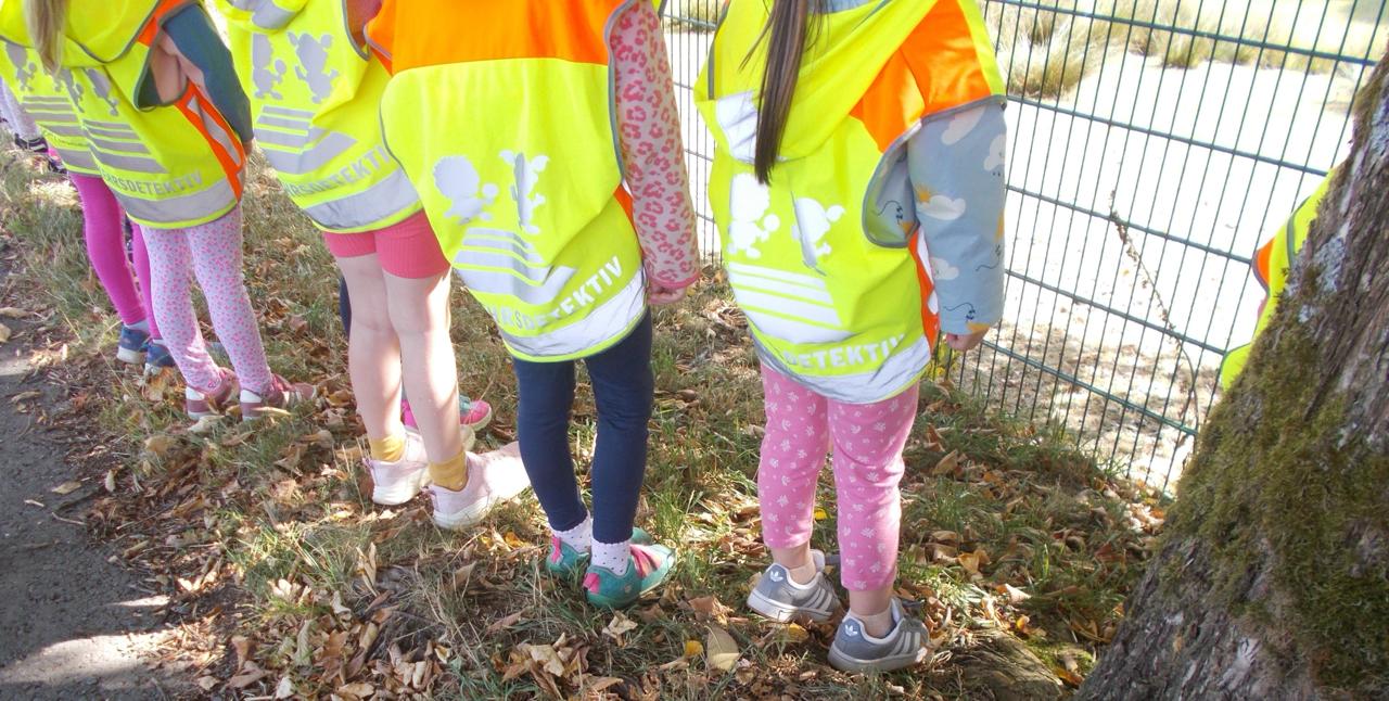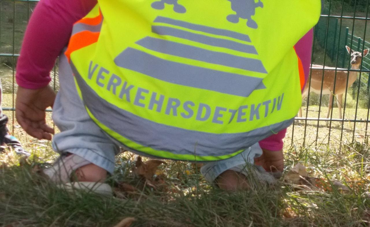 Mit Warnweste ausgestattet, begaben wir uns – nach einem ausgiebigen Frühstück – auf einen kleinen Spaziergang durch Schönau. Mit kurzem Zwischenstopp und Erklärungen an einem Hagebutten- und Haselnussstrauch, erreichten wir unser erstes Ziel: Das Rehgehege!