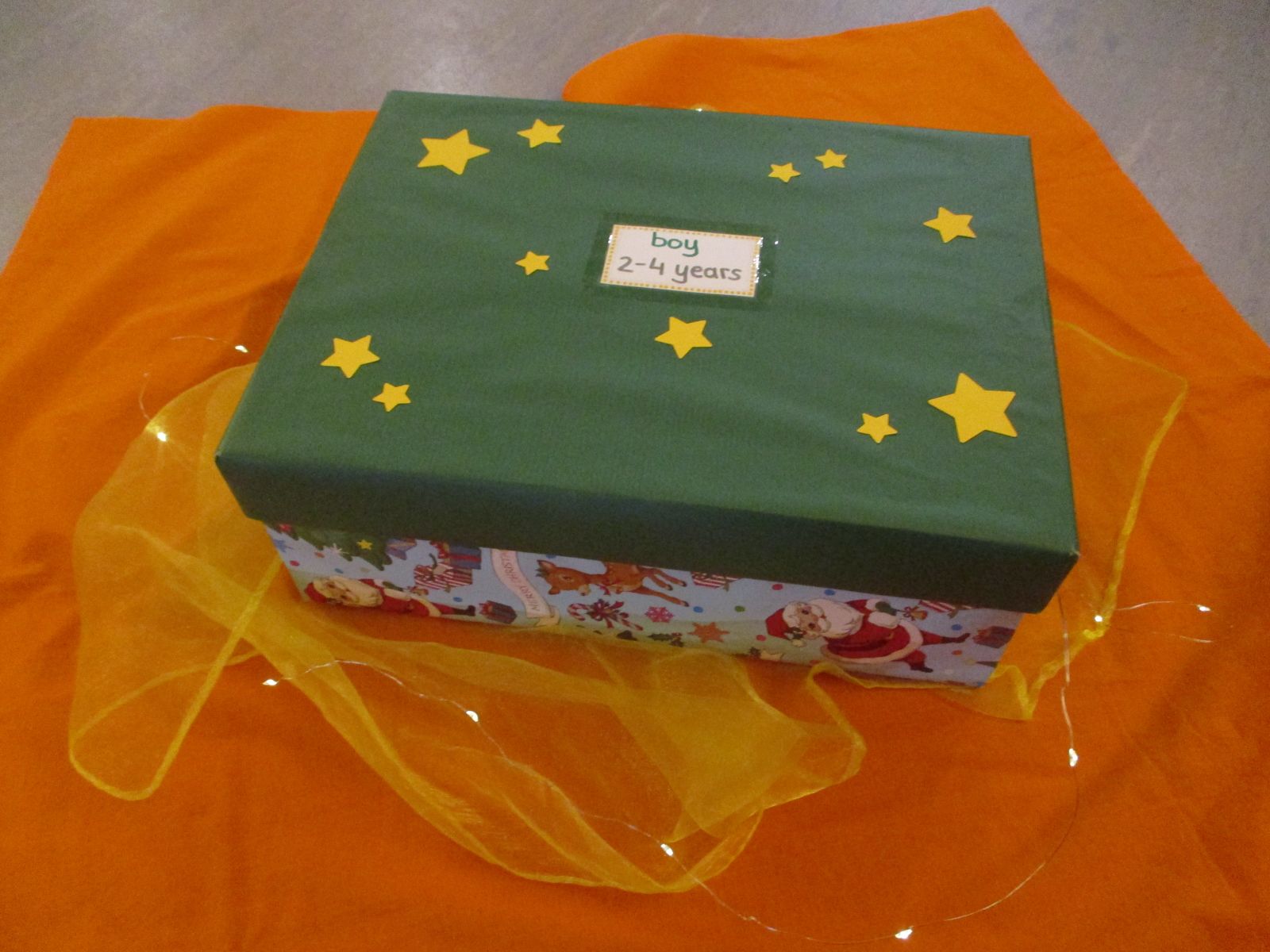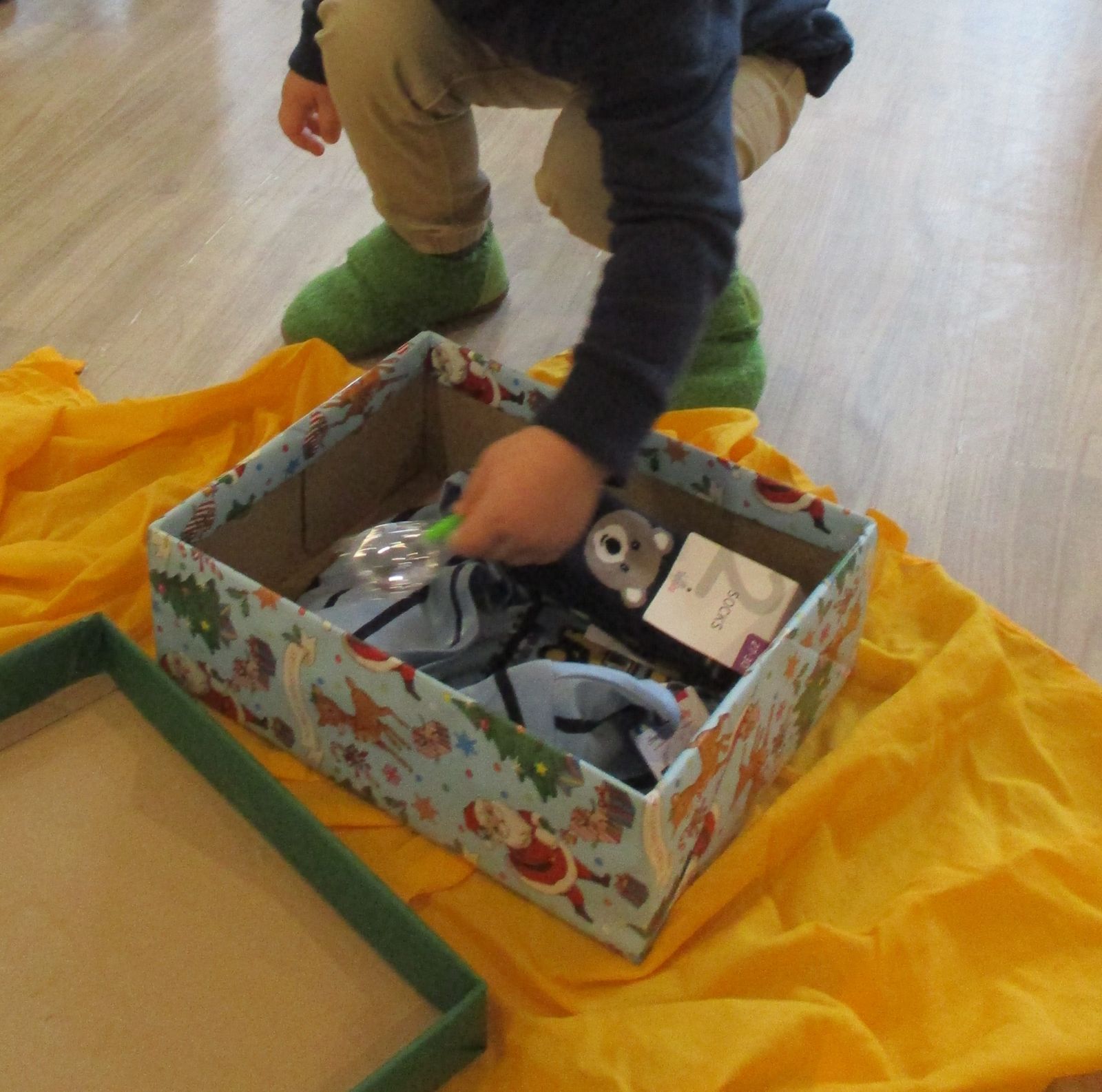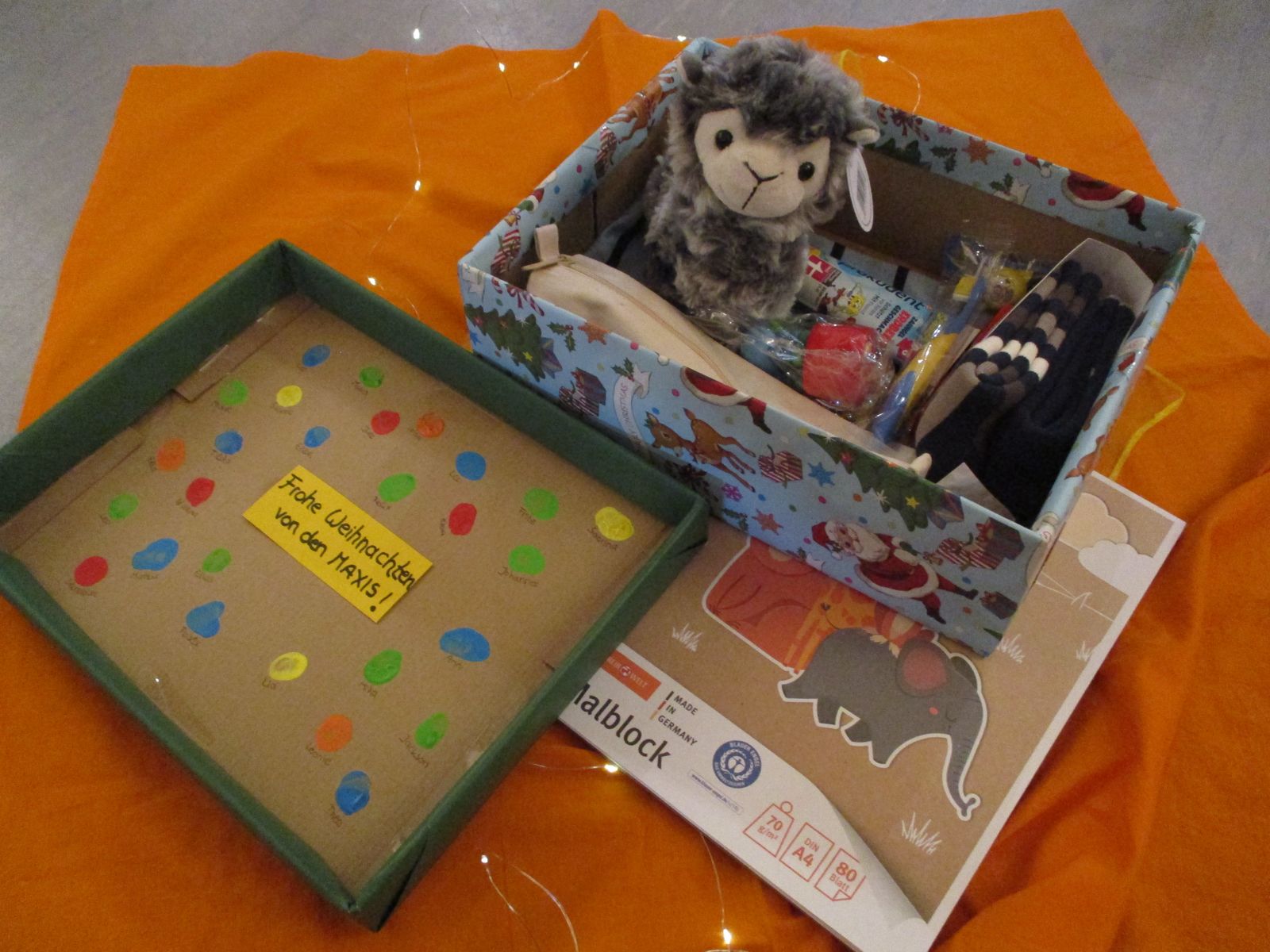 Da kam folgende Idee bei den MAXIS auf: wir nehmen an der öffentlichen Aktion „Weihnachten im Schuhkarton“ teil, die sich für Kinder aus armen Familien einsetzt. Denn wir haben festgestellt, dass besagte Kinder nur das Nötigste zum Anziehen haben und dass sie nicht so viel Spielzeug wie wir haben. Schnell war ein Schuhkarton mit Geschenkpapier eingepackt und die MAXIS haben ihn mit Freude am Teilen befüllt: ein Pullover, warme Socken, ein Kuscheltier, Zahnbürste und Zahnpaste, ein bisschen Spielzeug und etwas zum Malen. In die Innenseite vom Deckel hat noch jeder von uns als Gruß einen Fingerabdruck hinterlassen. Unser Päckchen haben wir anschließend zu einer offiziellen Abgabestelle gebracht, sodass es jetzt auf Reise geht. Darüber darf sich bald ein dreijähriger Junge in Osteuropa zu Weihnachten sehr freuen!